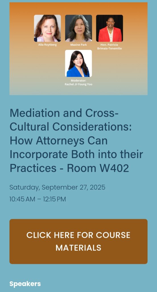 Rachel J. Yoo, Esq., Founder and Partner of Yoo Law Group, serves as a moderator for the program Mediation and Cross-Cultural Considerations and is the Co-Chair of ADR at AABANY.