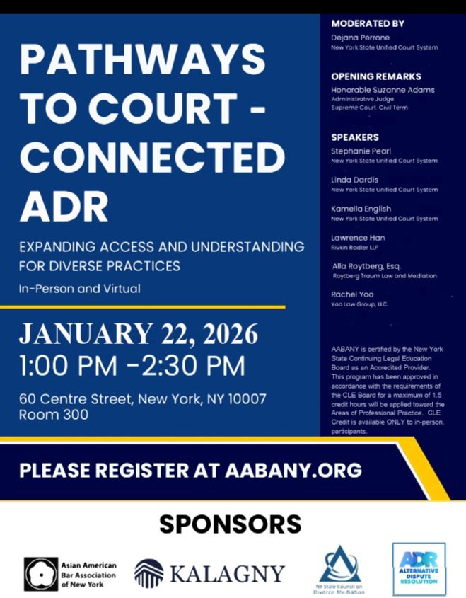 As a Co-Chair of AABANY’s ADR Committee, Rachel Yoo, Esq organizes this CLE program in collaboration with other well-respected organisations. Our goal is to encourage more legal professionals to join the court’s mediator community and contribute to the growth of effective dispute resolution practices.